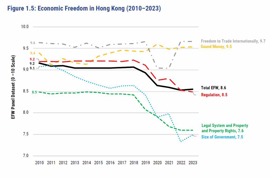 „Nejnovější kompletní údaje jsou z roku 2023, protože náš žebříček zobrazuje situaci vždy s dvouletým zpožděním, abychom měli spolehlivá data, a ne jen dojmy,“ vysvětluje Pánek. „Hongkong vykazuje pokles svobody již patnáct let, v roce 2018 však tento pokles nabral vyšší rychlost v důsledku represí a vměšování ze strany čínské vlády a očekáváme, že tento pokles bude pokračovat i nadále. Úpadek Hongkongu budeme nadále podrobně monitorovat,“ přislíbil Pánek. „Podle Human Freedom Indexu, který bere v potaz i občanské svobody, se Hongkong propadl z 3. místa na 46. již v roce 2021,“ doplňuje.