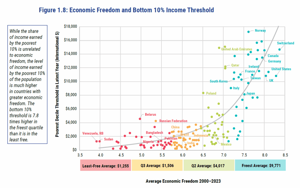 Také míra chudoby je nižší v ekonomicky svobodných zemích. V ekonomicky nejsvobodnějších zemích (první čtvrtina žebříčku) žije v extrémní chudobě (méně než 3,65 dolarů na den) 2 % obyvatel. V zemích ve spodní čtvrtině žebříčku je to 52 % obyvatel. Střední míra dožití je 79 let v ekonomicky nejsvobodnějších zemích, avšak 62 let v těch ekonomicky nejméně svobodných.