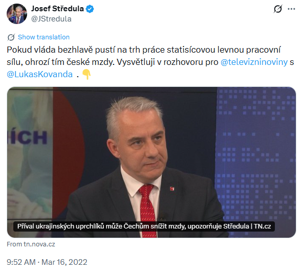 Ačkoliv se Vladimiru Putinovi podařilo nemožné a sjednotil českou politickou scénu takovým způsobem, že i SPD vítá migranty, už se objevují hlasy ve smyslu, že ukrajinská migrace bude mít negativní dopad na české mzdy.